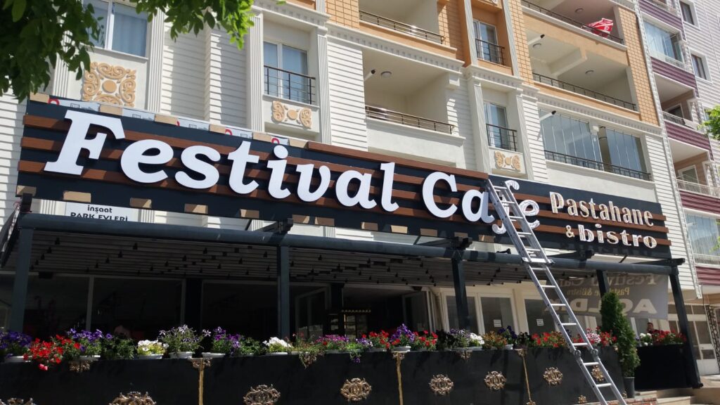 Festival Cafe Yerköy Yozgat ışıklı tabela çalışması Ensoy Reklam tarafından sorunsuz bir şekilde montajı yapılarak teslim edildi. Projede desenli kompozitten profiller üzerine pleksi kutu harf uygulandı. İçerisinde led ışıklar kullanıldı. Yağmur ve sudan etkilenmeyecek şekilde kenar kapamaları yapıldı. Ayrıca tabelanın içerisinde yer alan tüm elektrikle çalışan aksam IP66 korumasına sahiptir.