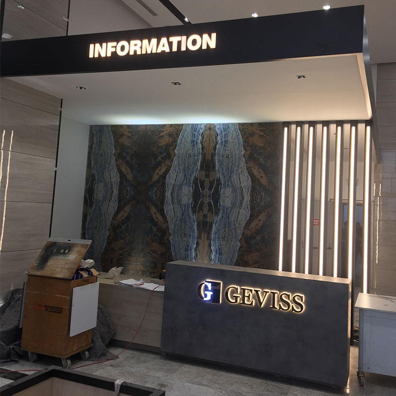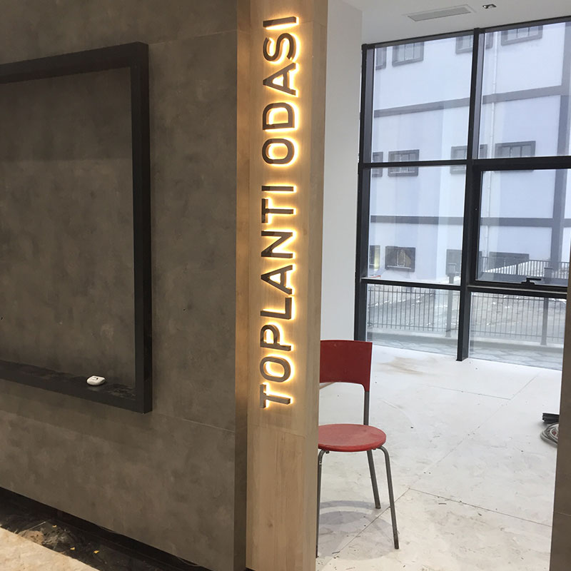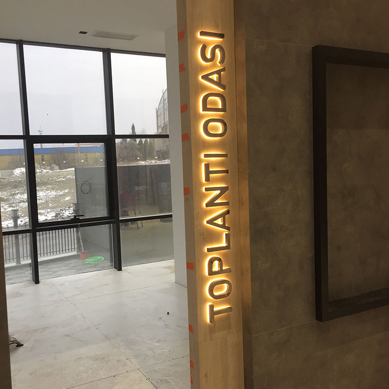 Projede 20 mm rakı pleksi üzerine platin paslanmaz kutu harf uygulaması yapıldı. İçerisinde led ışıklar kullanıldı.