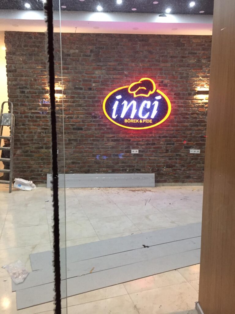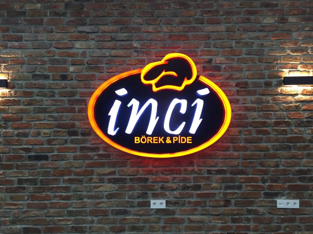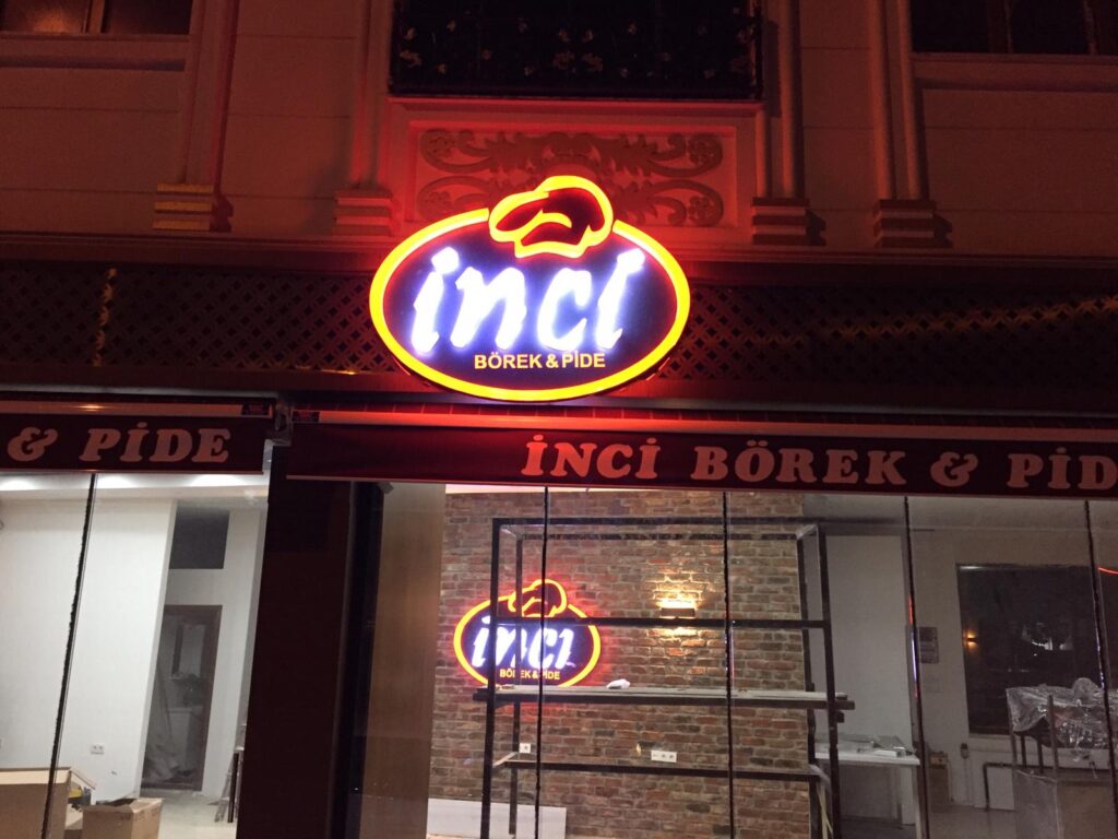 İnci Börek Pide Bayrampaşa ışıklı tabela çalışması Ensoy Reklam tarafından sorunsuz bir şekilde montajı yapılarak teslim edildi. Projede desenli kompozit cephe kaplama üzerine elips pleksi kutu harfler uygulandı. İçerisinde led ışıklar kullanıldı. Yağmur ve sudan etkilenmeyecek şekilde kenar kapamaları yapıldı. Ayrıca tabelanın içerisinde yer alan tüm elektrikle çalışan aksam IP66 korumasına sahiptir.